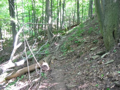 After the first short descent the trail is a bit flatter. It hasn't been cleaned up this spring. Lots of deadfall. There was little wildlife along this stretch. When we did it last there were dozens of cheeky chipmunks and squirrels. |