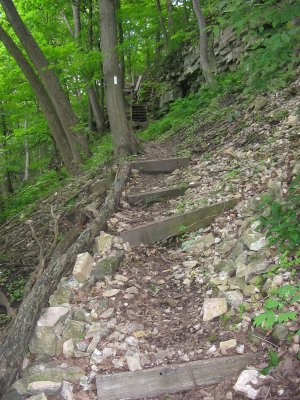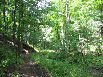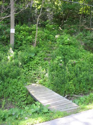 ![]() We continue along a stretch of trail mostly like this -- always sloping and I have sore ankles to prove it! A glade of deep grasses follows, then a quick drop through wooded stand to real stairs that take us the last twenty feet down to Wilson St. See the "stairs" in the next box. |