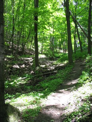 ![]() Rather than the narrow side of the road, we chose to cross Wilson to where the Bruce Trail continues -- and we could sit down for five minutes on the roadside barrier. A readjustment of socks, time to catch our breath and drink some much appreciated water from our packs, then we hit the trail again to return back the way we came. This time we are almost constantly ascending and breathless. |