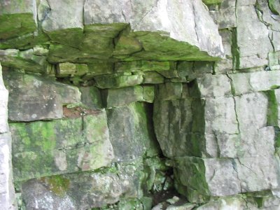 ![]() Going down the escarpment again after a lovely walk along the edge. I thought this niche in the escarpment face was fairly interesting. Many different kinds of moss are growing. Then I thought about how the rocks above were hanging unsupported and very nicely cracked over the space where I was standing. I decided to move. |