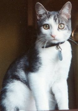 Ashley was the "dean" of the Hayman cats. He was adopted in 1984 from the Hamilton SPCA as a tiny kitten. He was very much Judith's (and sometimes Dave's) cat. He knew the sound of our two family cars, and sat and waited on the stairs with great disapproval if we stayed out too late. Or if we were in the door for more than thirty seconds and hadn't fed him yet. Ashley's favourite summer sport was lying in the sun. His favourite winter sports were lying in the sun and on the hot air register. Sometimes he would play (and play hard and silly), but only if he thought the other cats couldn't see him (dignity at all costs...). At his peak he weighed all of nine pounds (though closer to five near the end). He had huge green eyes, and short, dark grey and white fur that looked like a gentleman in a velvet morning coat. But how many cats do you know that were Captain of their own starship (the USS P'Ahs)? He was named for both his colour and Ashley Wilkes from Gone With the Wind. At age sixteen he was diagnosed with hyperthyroid and mild renal failure, which we treated, since he was still very playful and a generally feisty little dude. After seventeen and a half years of giving us companionship and trust, Ashley started to show us that it was time for him to go. That last summer was a joy for him, with so many warm sunny days to spend lying on his lounge, on his patio. But his last month he began to fade, and more so the last two days. Right to the end his personality was far larger than his tiny fragile frame. On Monday October 15, 2001, rather than break his trust, we helped him find the door into his everlasting summer. |