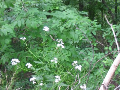 We picked up the trail just west of 403. Nothing significant about the flowers except that they're pretty. There were lots of them. This section starts with a long boggy section, heavily wooded. In some areas rocks or wood had been thrown down to keep feet more or less dry. A "stairway" assisted on one of the nasty bits of descent. |