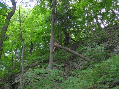 ![]() At this level we are at the same height or higher than the tops of trees below this part of the escarpment. Peeking through we can see the pond that the stream we're approaching feeds. The trail is relatively easy so far, with rock and tree branches aplenty. Only a few places of dicey footing. |