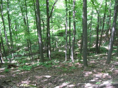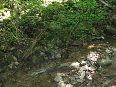 We turn uphill again for a while. Just beyond the deadfall in the bottom of the picture is the bridge. This is the furthest we came on our last jaunt to this area. The stream is rushing pretty fast, about eight feet below the bridge. |