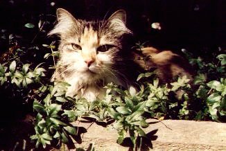 Moddy came to us as a tiny kitten in 1986. Though the bigger of the cats, Moddy is only ten pounds. Okay, maybe 11. She's had some ill health of late, but that's to be expected. She is a venerable old calico (black, white and orange) tabby with ultra long fur and lovely yellow-green eyes. Her mother was abandoned with her kittens at the home of the woman who was then Judith's supervisor. The Hayman's adopted her because she was the only kitten from the litter brave enough to come and investigate us, and because she has extra toes on her big feet. We called her Modesty, after the comic, book and movie character, Modesty Blaise. Just like the character she responds to the nickname "Princess". Moddy firmly believes that she is Empress of the Universe. But she's definitely not as "cute but dumb" as she looks. Moddy learned how to open the screen door to the patio. Wish she'd learn how to shut it!! She's a wonderful cat who loves music and being sung to and will come right up to a singer. This is very cute until she decides to lay down on the music! Or to sing along. She is amazingly sociable and always in the center of company. Her favourite sports are lying down, sleeping and being fed (though she does play when the mood strikes. Noblesse oblige), though she is a gold medalist in bug-chasing. Butterflies are her favourite. She prefers Richard or Dave to the ladies and inevitably sleeps on Rich's bed.. |